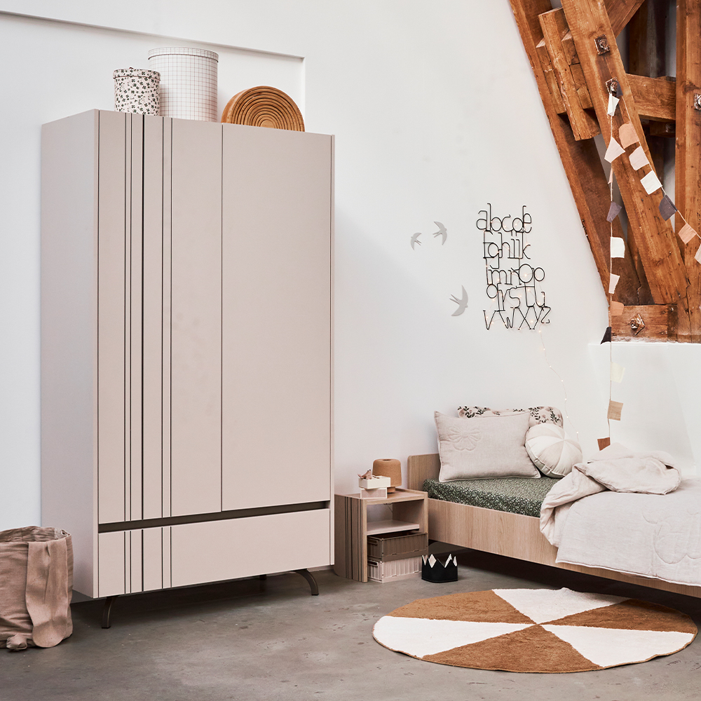 Handige, fraaie kledingkast voor iedere babykamer en kinderkamer. Onze kledingkast is een mooi meubel dat past in elk interieur. De kast heeft een hang gedeelte met twee roedes, leg-gedeelte met vier legplanken en een opberglade. Met het push-to-open systeem open je makkelijk de deuren van de kast. De lade is makkelijk te openen via de greeplijst en voorzien van soft-close sluiting.